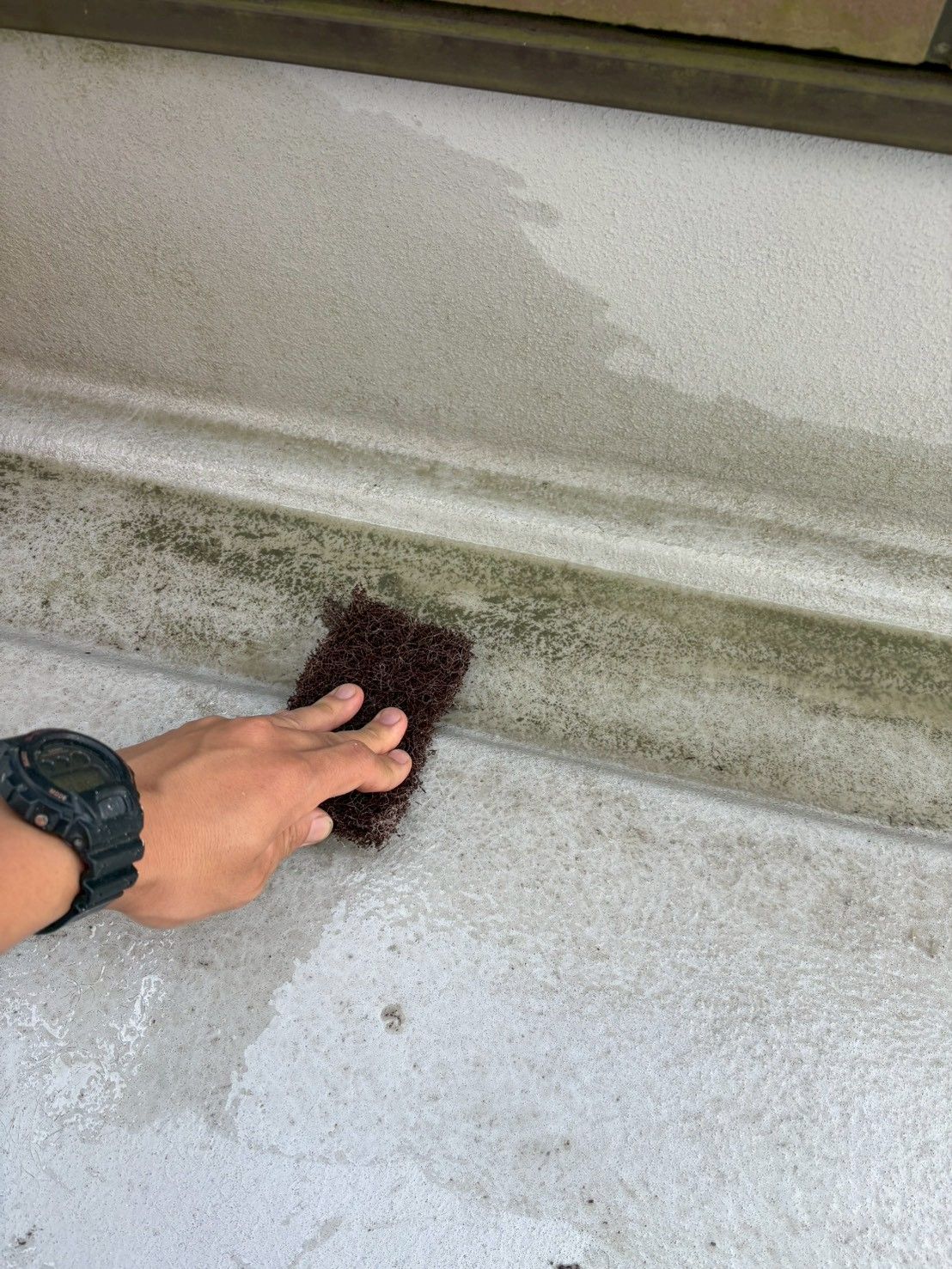 特に排水溝付近は湿気が溜まりやすく、苔や汚れが固まりやすい場所のため、 ブラシやパッドを使い分けて丁寧に作業しました。