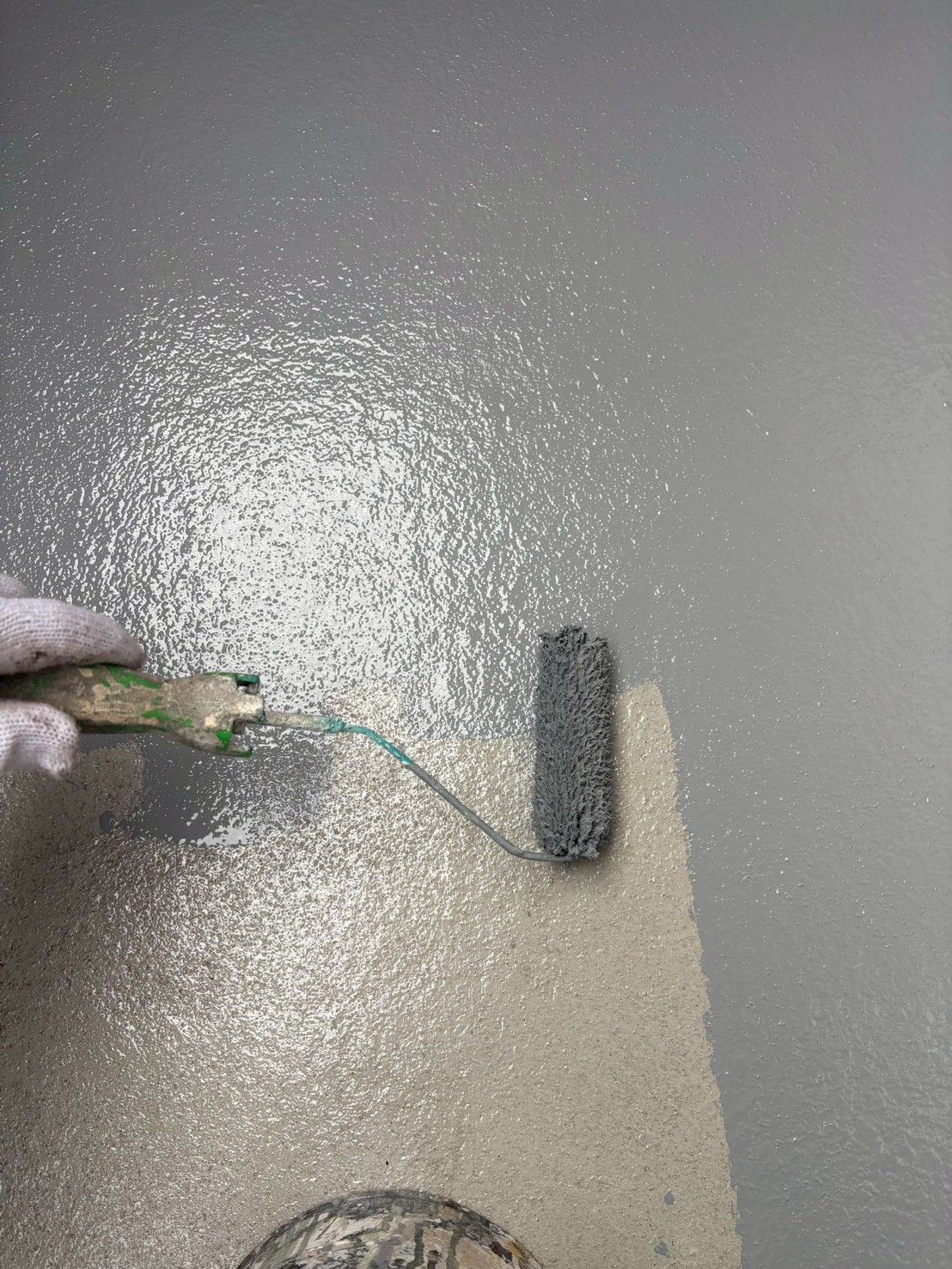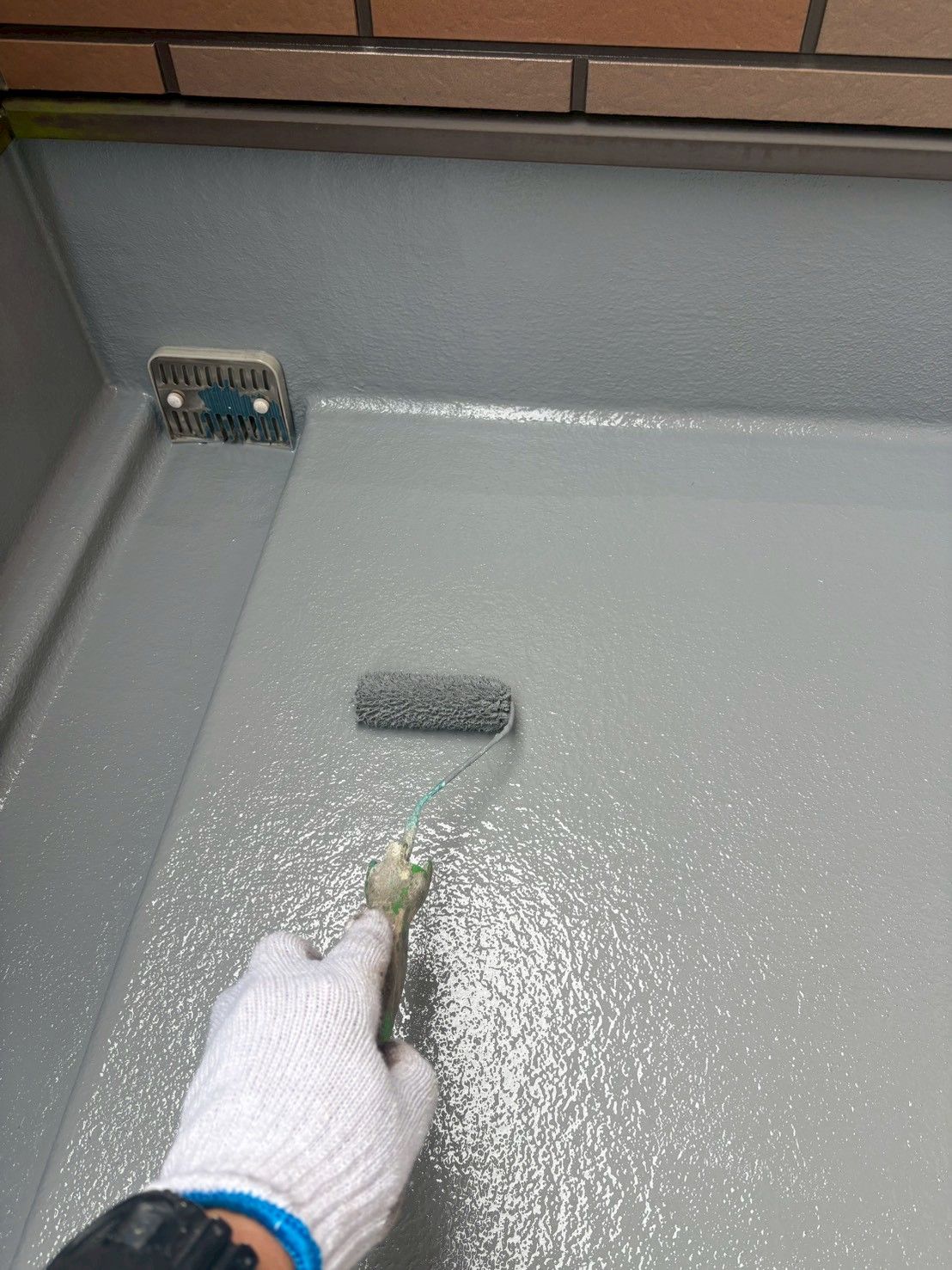 床面・立ち上がり部分・排水溝まわりなど、形状の異なる部位に合わせて ローラーと刷毛を使い分け、まんべんなく塗布していきます。